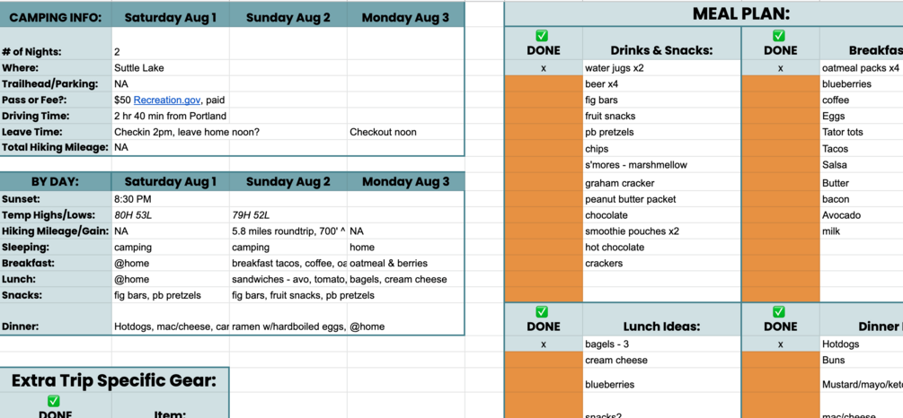 Use this spreadsheet to plan out your camping trips. Spend your time enjoying the outdoors instead of trying to remember what to pack!