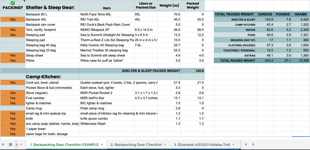 This Backpacking Gear List Spreadsheet helps you keep track of all your camping gear, gear weight, backpacking itineraries, and backpack weight calculator.